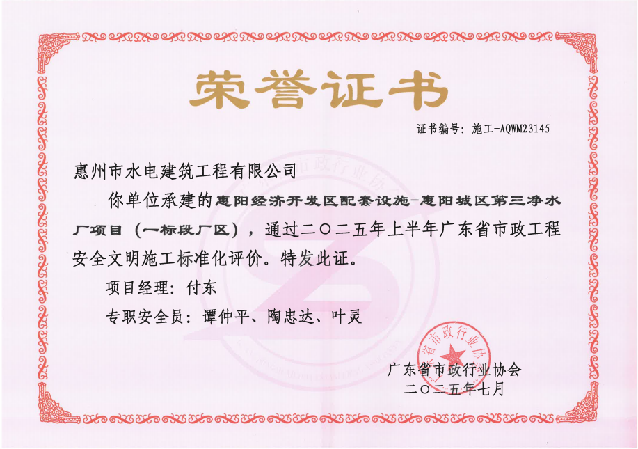 惠州市水電建筑工程有限公司成立于一九六四年四月,隸屬惠州市水務(wù)集團(tuán)有限公司,是一家國(guó)有綜合性施工企業(yè),主營(yíng)水利水電工程、房屋建筑、市政工程等施工業(yè)務(wù)。公司擁有水利水電工程施工總承包一級(jí)、建筑工程施工總承包一級(jí)、市政公用工程施工總承包一級(jí)、公路工程施工總承包三級(jí),公路路基、路面及建筑裝修裝飾專(zhuān)業(yè)承包二級(jí),環(huán)保工程、機(jī)電安裝、河湖整治、輸變電工程專(zhuān)業(yè)承包三級(jí)等經(jīng)營(yíng)資質(zhì)……